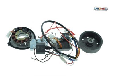 Pokud chcete přejít z 6V el. soustavy na 12V el. soustavu je třeba vyměnit také baterii, klakson a všechny žárovky. Výkon systému až 100 w. Sadu lze použít i jako náhradu za jiné elektronické zapalování. Sada má zvětšené magnety, který jsou pevnější a ani v extrémních podmínkách nemůže dojít k jejich poškození. Zapalování je vhodné i pro tuning, protože pracuje až do 16 000 ot/min. Přerušovač blinkrů je elektronický pro odběr 2W - 50W, funguje jak pro standardní žárovky tak i pro LED blinkry.