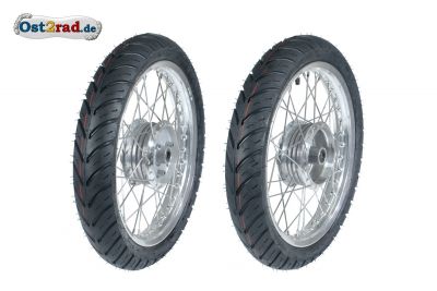Obsah dodávky: 2 x nába , výplet nerez, 4 x ložisko kola, pojistné kroužky, 2 x distanční kus, ráfek Alu eloxovaný 1,85 x 16 černá prášková barva, pneumatiky, duše a páska na ráfek, vše připraveno k montáži. Pneumatiky jsou nízkoprofilové sliky. Přesné označení 80/80-16 TT M/C 46P SPORT (170kg - 150 km/h ), nylon 6PR, PneuRubber rok výroby 2022. Nutný zápis v TP.