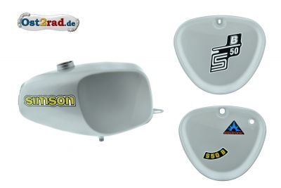 Sada nádrž a 2 kastlíky pro moto Simson S50, S51, S53. Nádrže je riginální pro Simson S50, byla označovaná jako buvolí. Nádrž a kastlíky jsou opatřené základovou barvou a vrchním lakem barva stříbrná, podobná barvě S51 enduro.