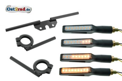 Blinkry jsou včetně držáků pro moto Simson Typen S50, S51, S70 , vnějším průměr držáku 10mm , vnitřní závit M8 k našroubování blinkrů. Držáky jsou opatřené černou práškovou barvou. Sada obsahuje 2 x přední držák, 1 x zadní držák. Blinkry montujte pouze do motocyklů s baterií, která vyrovnává napěťové špičky! Délka bez závitu cca. 100mm, světelná plochá 56x10mm.
