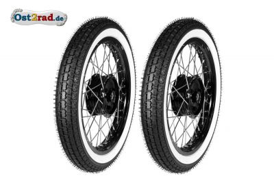 2 x kolo kompletní s pneumatikou s bílými boky a klasickým silničním vzorkem pro SIMSON s 16'' koly a ráfky 1.6-16. Tento rozmě je standartní pro moto SIMSON Spatz SR4-1, Star SR4-2, Sperber SR4-3, Habicht SR4-4, KR50, Schwalbe KR51/1 a KR51/2, S50, S51, S70 a další. Komplet pro přední a zadní kolo. Obě kola jsou vyvážená.