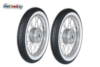 2 x kolo kompletní s pneumatikou s bílými boky a klasickým silničním vzorkem pro SIMSON s 16'' koly a ráfky 1.6-16. Tento rozmě je standartní pro moto SIMSON Spatz SR4-1, Star SR4-2, Sperber SR4-3, Habicht SR4-4, KR50, Schwalbe KR51/1 a KR51/2, S50, S51, S70 a další. Komplet pro přední a zadní kolo. Obě kola jsou vyvážená.