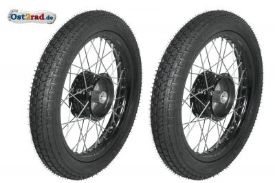 2 x kolo kompletní s pneumatikou Racing do 150km/h, silniční vzorek pro moto SIMSON s 16 koly. Větší rozměr než originál (3,00 proti 2,75), vhodné pro moto Spatz SR4-1, Star SR4-2, Sperber SR4-3, Habicht SR4-4, KR50, Schwalbe KR51/1 a KR51/2, Mokick Typen S50, S51, S70 bez změn na motocyklu. Vhodné pro přední i zadní kolo. Kola jsou kompletní, vyvážená.